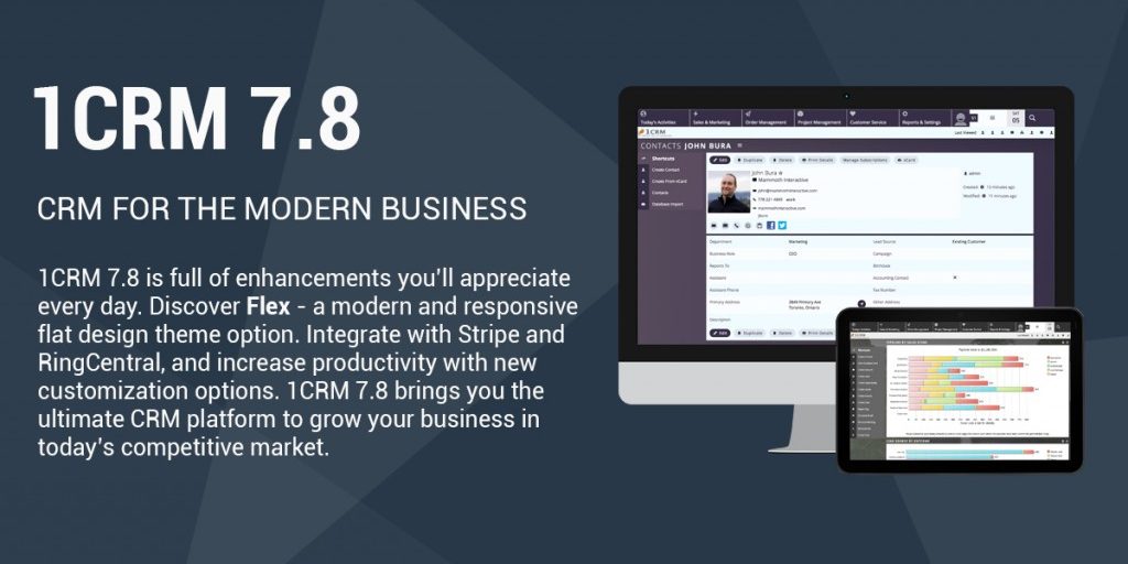 Michael Whitehead, CEO of 1CRM Corp. commented “The 7.8 release of 1CRM really reinforces our core software philosophy at 1CRM: Extend the CRM model to include a wide range of general business management, make it affordable by small-medium businesses, and integrate out-of-the-box with all the products and services those businesses will already be using. The RingCentral and Stripe integrations really broaden the range of business models that 1CRM serves, and the Flex theme offers a modern new interface that many users are looking for.”