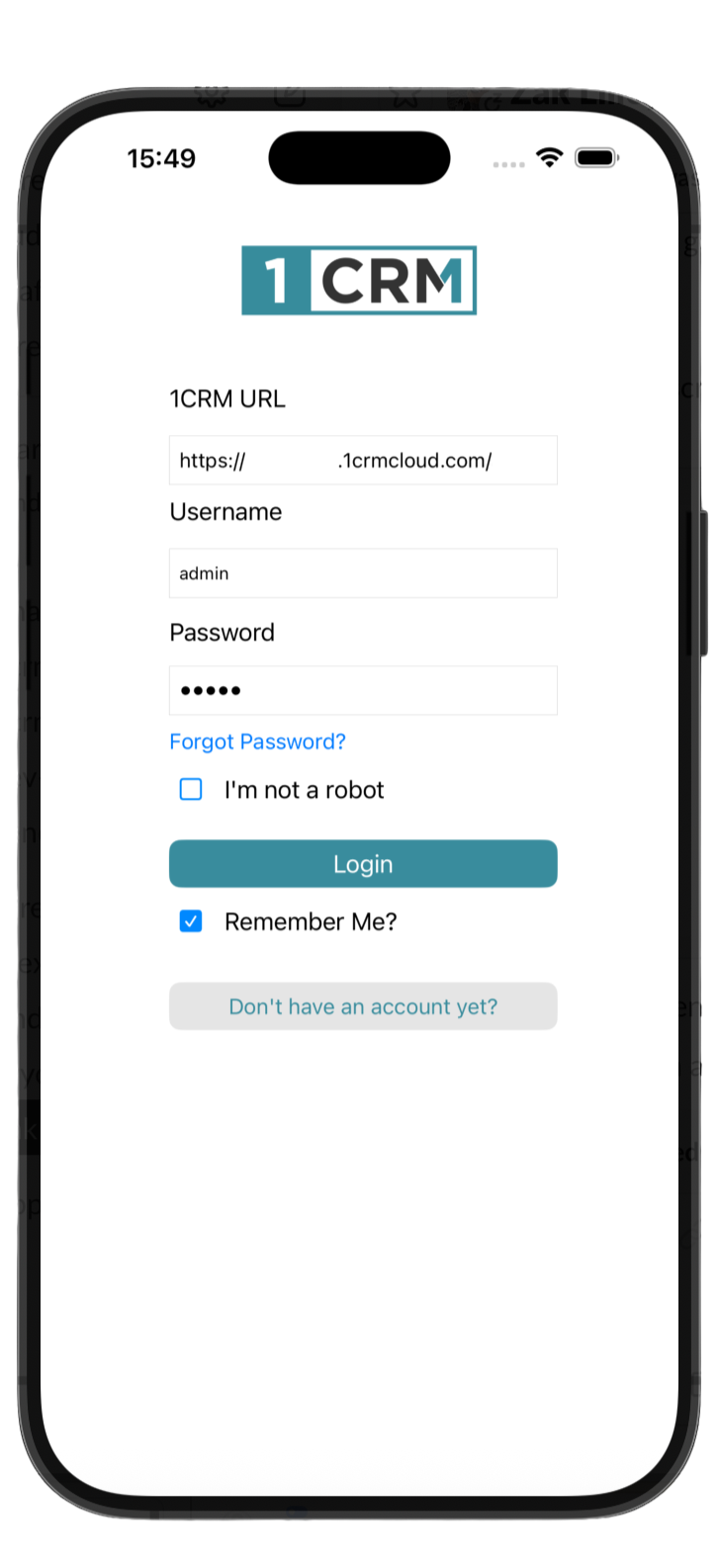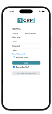 Just enter the web URL for your own 1CRM system (remember the https:// prefix), plus your normal system username and password, and click on Login. It’s also really handy if you want to enable the toggle switch for Remember Me – then your URL, username and password will always be there the next time you need to login.