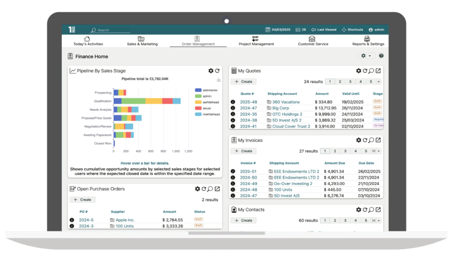 1CRM ensures that your finances stay in order by managing and tracking bills through their life-cycle. Overdue bills are highlighted for quick attention, and you can simply click to record outgoing payments. Each Bill shows the original amount, as well as the current balance payable after any outgoing payments have been applied.